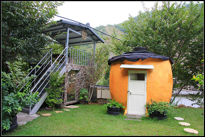 ↓營地入口處的瞭望休息台,下方的橘色榖倉也是民宿~